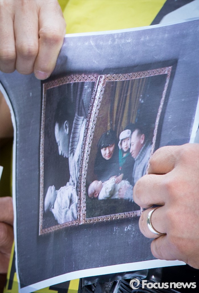(서울=포커스뉴스)영국과 덴마크에서 옥시레킷벤키저 본사와 케톡스 본사를 항의 방문했던 가습기 살균제 피해자 유족 김덕종(40)씨가 11일 오후 서울 영등포구 여의도 옥시 한국본사 앞에서 열린 귀국 기자회견에 참석해 가습기 살균제 피해로 세상을 떠난 아들 승준군의 사진을 공개하고 있다.
