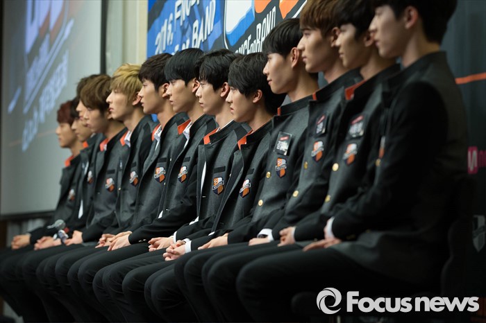 (서울=포커스뉴스) 11일 오후 서울 마포구 스탠포드 호텔에서 Fnc 엔터테인먼트 소속 댄스팀과 밴드팀13명이 Mnet 'Dance or Band' 제작발표회에 참석해 질의응답 시간을 갖고 있다.