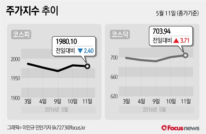 (서울=포커스뉴스) 11일 코스피지수는 전날 보다 0.12%(2.40포인트) 내린 1980.10에 장을 마쳤다. 코스닥지수는 전일 대비 0.53%(3.71포인트) 오른 703.94에 마감했다.