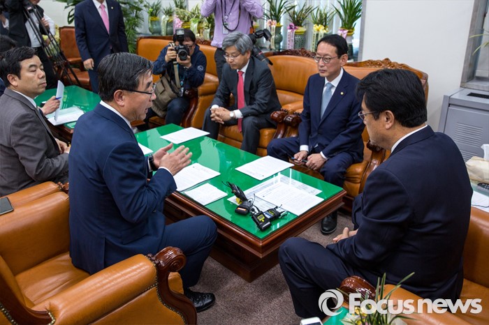 (서울=포커스뉴스) 이기권(오른쪽) 고용노동부 장관이 11일 오후 서울 여의도 국회에서 정진석 새누리당 원내대표에게 노동개혁 관련 주요 현안 보고를 마치고 있다.