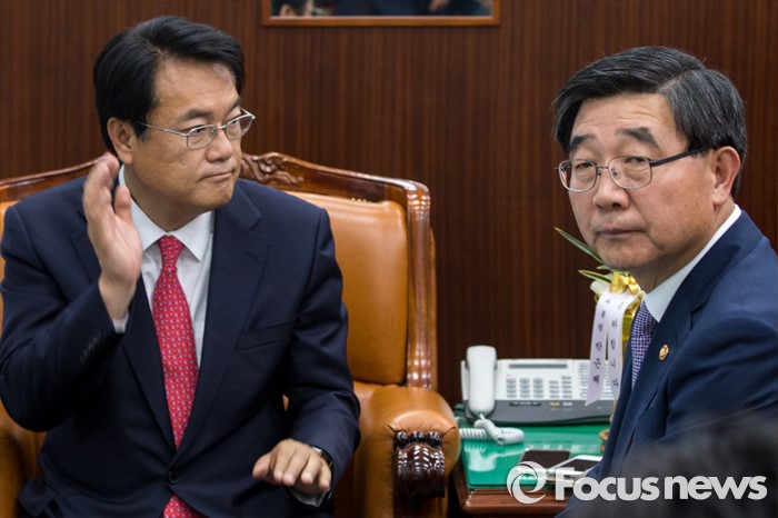 (서울=포커스뉴스) 이기권(오른쪽) 고용노동부 장관이 11일 오후 서울 여의도 국회에서 정진석 새누리당 원내대표에게 노동개혁 관련 주요 현안 보고를 마치고 있다.