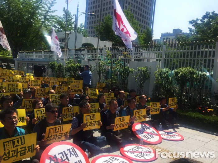 (서울=포커스뉴스) 정부의 성과연봉제 도입 강행을 두고 공무원들이 한 자리에 모여 비판의 목소리를 높였다.