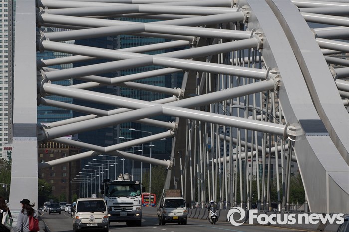 (서울=포커스뉴스) 11일 오후 서울 양화대교 아치위에 고공시위, 투신자살 등을 예방하기 위해 롤러로 된 오름방지 시설물이 설치되어 있다.