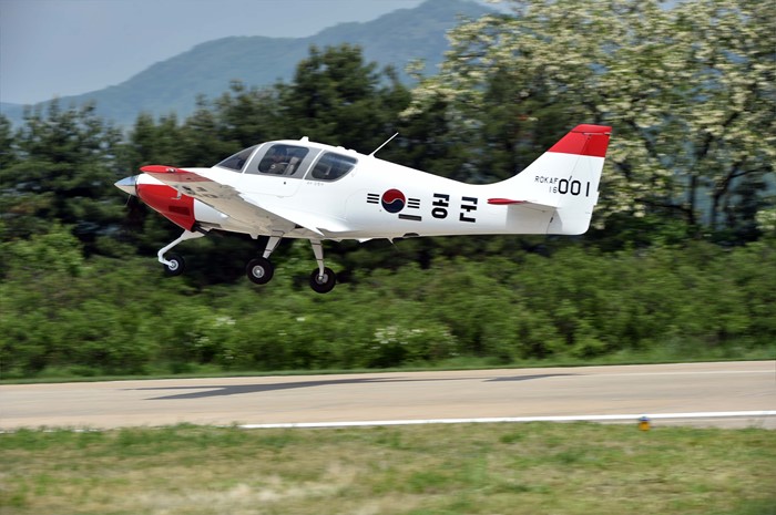 (서울=포커스뉴스) 11일 공군사관학교 제55교육비행전대에서 KT-100 입문훈련기가 힘차게 이륙하고 있다. <사진제공=공군>