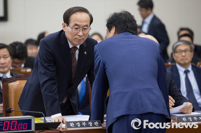 (서울=포커스뉴스) 윤성규(왼쪽) 환경부 장관이 11일 오후 서울 여의도 국회에서 가습기 살균제 관련 현안보고 등을 위해 열린 환경노동위원회 전체회의에 참석해 관계자와 대화하고 있다.