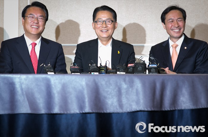 (서울=포커스뉴스) 11일 오후 서울 여의도 국회 귀빈식당에서 열린 3당 원내지도부 회동에 참석한 정진석(왼쪽부터) 새누리당 원내대표, 박지원 국민의당 원내대표, 우상호 더불어민주당 원내대표가 미소 짓고 있다.