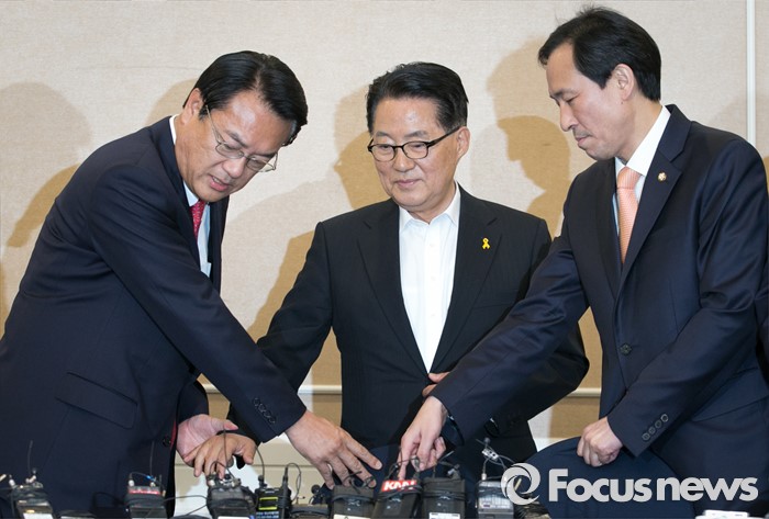 (서울=포커스뉴스) 11일 오후 서울 여의도 국회 귀빈식당에서 열린 3당 원내지도부 회동에 참석한 정진석(왼쪽부터) 새누리당 원내대표, 박지원 국민의당 원내대표, 우상호 더불어민주당 원내대표가 자리 논의를 하고 있다.