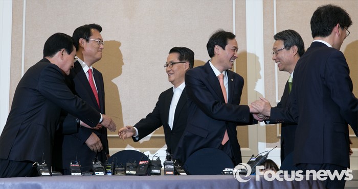 (서울=포커스뉴스) 11일 오후 서울 여의도 국회 귀빈식당에서 열린 3당 원내지도부 회동에 참석한 의원들이 인사하고 있다. 왼쪽부터 변재일 더불어민주당 정책위의장, 정진석 새누리당 원내대표, 박지원 국민의당 원내대표, 우상호 더불어민주당 원내대표, 김성식 국민의당 정책위의장, 박완주 더불어민주당 원내수석부대표.