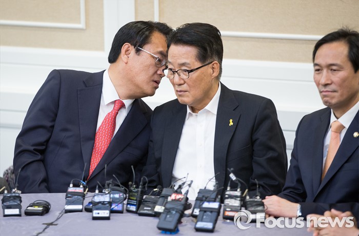 (서울=포커스뉴스) 정진석(왼쪽) 새누리당 원내대표와 박지원(가운데) 국민의당 원내대표가 11일 오후 서울 여의도 국회 귀빈식당에서 열린 3당 원내지도부 회동에 참석해 귀엣말을 하고 있다. 오른쪽은 우상호 더불어민주당 원내대표.