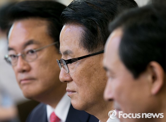 (서울=포커스뉴스) 11일 오후 서울 여의도 국회 귀빈식당에서 열린 3당 원내지도부 회동에 참석한 정진석(왼쪽부터) 새누리당 원내대표, 박지원 국민의당 원내대표, 우상호 더불어민주당 원내대표가 생각에 잠겨 있다.