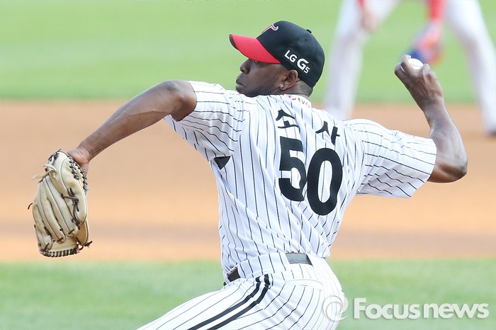 | △ 힘차게 볼을 뿌리는 LG 선발투수 소사 |