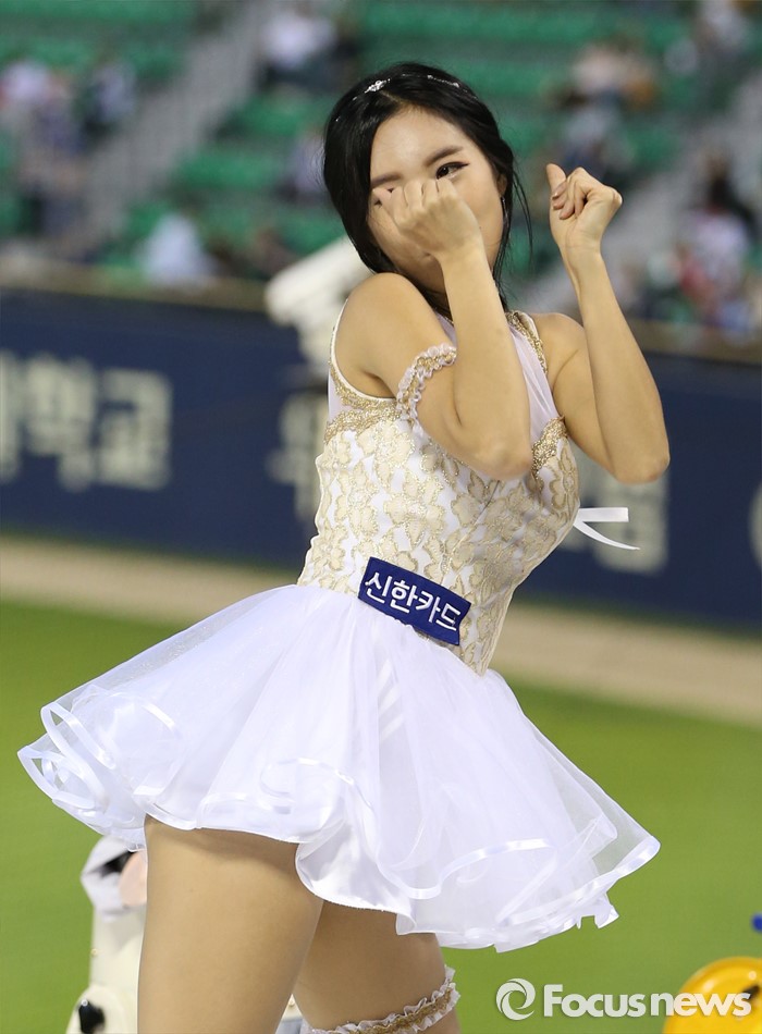 (서울=포커스뉴스) 11일 서울 잠실구장에서 열린 2016 프로야구 삼성-LG 경기에서 LG 치어리더가 순백의 짧은 치마를 입고 정열적인 안무로 관중들의 시선을 모으고 있다.
