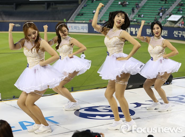 (서울=포커스뉴스) 11일 서울 잠실구장에서 열린 2016 프로야구 삼성-LG 경기에서 LG 치어리더가 순백의 짧은 치마를 입고 정열적인 안무로 관중들의 시선을 모으고 있다.