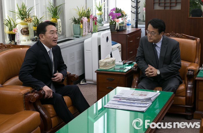 (서울=포커스뉴스) 정진석(오른쪽) 새누리당 원내대표가 12일 오전 서울 여의도 국회를 방문한 현기환 청와대 정무수석과 만나 대화하고 있다.