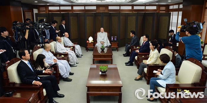 (서울=포커스뉴스) 정진석(오른쪽 네 번째) 새누리당 원내대표가 12일 오전 서울 종로구 조계사에서 자승 대한불교조계종 총무원장을 예방 하고 있다.