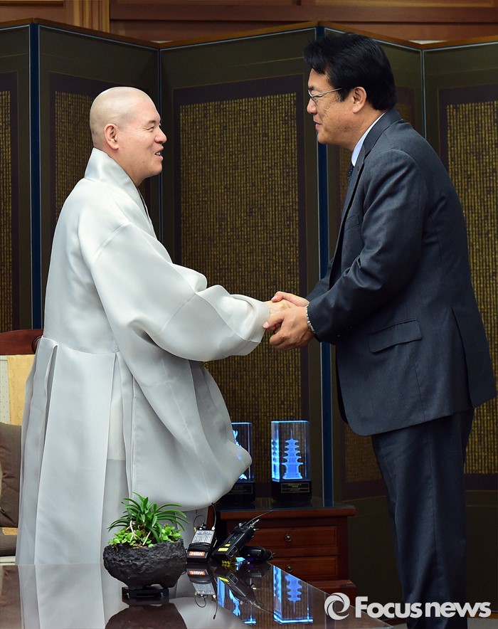 (서울=포커스뉴스) 정진석(오른쪽) 새누리당 원내대표가 12일 오전 서울 종로구 조계사에서 자승 대한불교조계종 총무원장을 예방해 악수 하고 있다.