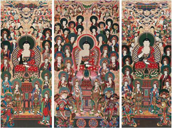 최유현 자수장 보유자는 1936년 전남 보성에서 태어나 10대부터 자수에 발을 디뎠으며, 1996년에 국가무형문화재 보유자로 인정됐다. 여든을 넘긴 나이에도 늘 창작 자수기법을 찾아내는데 열정을 다하는 예술가이며 교육자이기도 하다.왼쪽부터 최수현 자수장 보유자의 아미타불도, 석가모니불도, 약사불도.<사진제공=문화재청>
