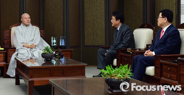 (서울=포커스뉴스) 정진석(오른쪽 두 번째) 새누리당 원내대표가 12일 오전 서울 종로구 조계사에서 자승 대한불교조계종 총무원장을 예방 하고 있다.
