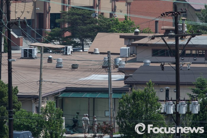 (서울=포커스뉴스) 주한미군이 지카 바이러스 실험을 추진하고 있다는 보도로 논란이 일어난 12일 오전 미군들이 서울 용산구 주한미군기지 내 한 건물 앞에서 대화를 나누고 있다.