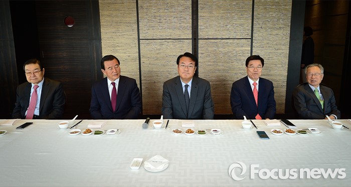 (서울=포커스뉴스) 정진석(오른쪽 세번째) 새누리당 원내대표와 김광림(오른쪽 두번째) 정책위의장 등이 12일 오후 서울 여의도 한 중식당에서 상임고문단과 오찬을 하고 있다.