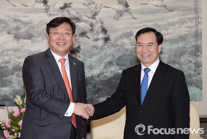 (서울=포커스뉴스) 주형환 산업통상자원부 장관이 12일(현지시간) 중국 요녕성 당위원회 사무실에서 리 시(李希, Li Xi) 중국 요녕성 당서기와 양국 대표단이 참석한 가운데 면담에 앞서 악수를 하고 있다. <사진제공=산업통상자원부>