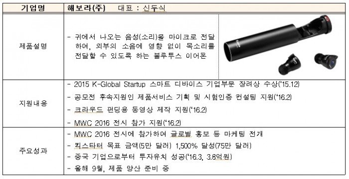 지난해 12월 K-글로벌 스타트업스마트 디바이스 공모전에 입상한 해보라는 홍보동영상을 활용해 세계 최대 크라우드 펀딩 서비스인 ‘킥스타터’ 최상위 0.05%에 해당하는 75만 달러(한화 약 8억5000만원, 목표액 1500% 달성) 펀딩에 성공했다. 나무는 킥스타터에서 7만 달러(한화 약 8100만원, 목표액 141% 달성), 유퍼스트는 국내 크라우드 펀딩 서비스인 ‘와디즈’에서 540만원(목표액 108% 성공) 펀딩에 성공했다.
