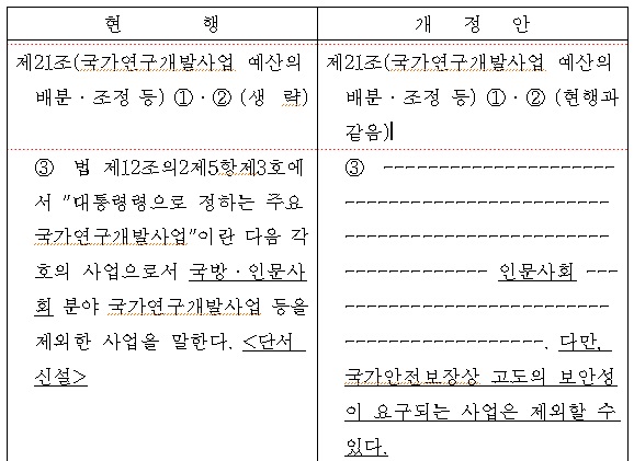 정부는 국방 R&D를 국가과학기술심의회의 심의대상에서 제외하던 과학기술기본법 시행령을 개정해 국가안전보장상 고도의 보안성이 요구되는 사업을 제외하고는 다른 일반부처 R&D와 같이 사전심의를 받도록 했다.