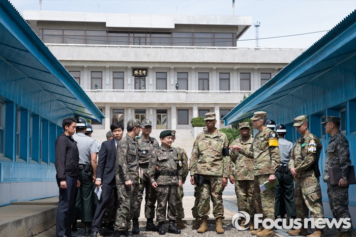 (파주=포커스뉴스) 빈센트 브룩스(오른쪽 다섯번째) 신임 한·미연합사령관 겸 주한미군사령관과 이순진(오른쪽 여섯번째) 합참의장이 12일 오후 경기도 파주시 판문점 공동경비구역(JSA)을 방문, 관계자로부터 설명을 듣고 있다.