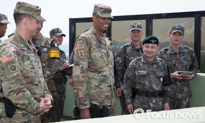 (파주=포커스뉴스) 빈센트 브룩스 신임 한·미연합사령관 겸 주한미군사령관과 이순진 합참의장이 12일 오후 경기도 파주시 JSA(공동경비구역)를 방문, 오울렛 초소에서 관계자로부터 설명을 듣고 있다.