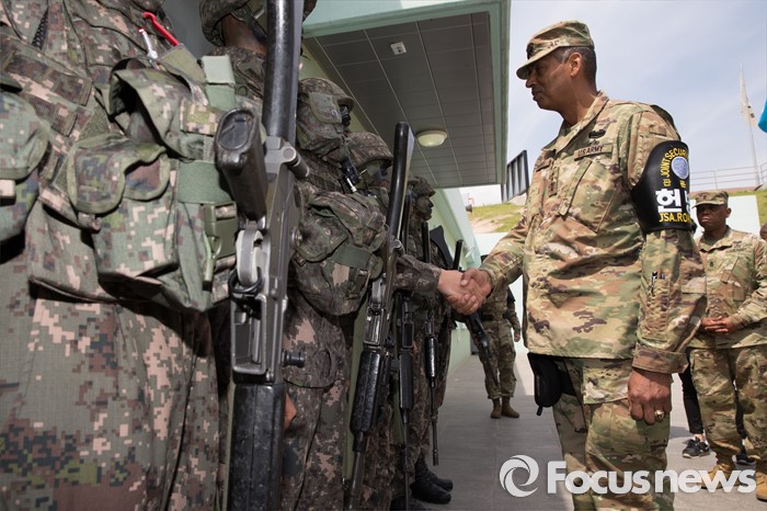 (파주=포커스뉴스) 빈센트 브룩스 신임 한·미연합사령관 겸 주한미군사령관이 12일 오후 경기도 파주시 JSA(공동경비구역)를 방문, 오울렛 초소에서 한국군 장병들과 악수를 하고 있다.