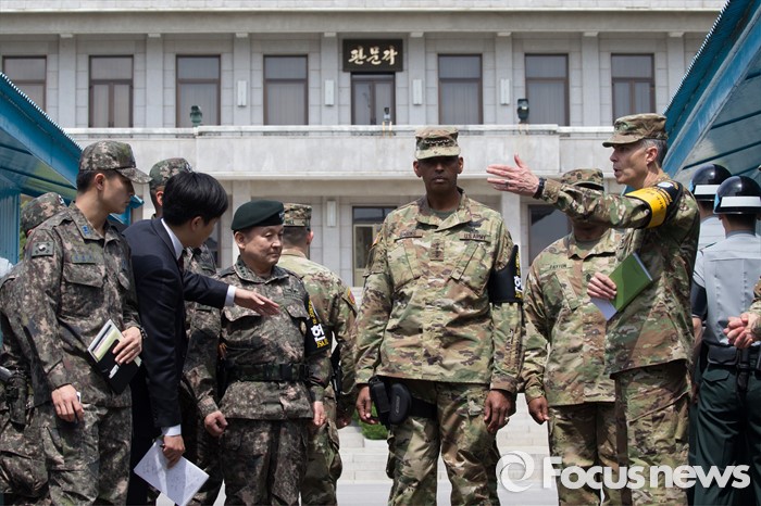 (파주=포커스뉴스) 빈센트 브룩스(오른쪽 세번째) 신임 한·미연합사령관 겸 주한미군사령관과 이순진(오른쪽 네번째) 합참의장이 12일 오후 경기도 파주시 판문점 공동경비구역(JSA)을 방문, 관계자로부터 설명을 듣고 있다.