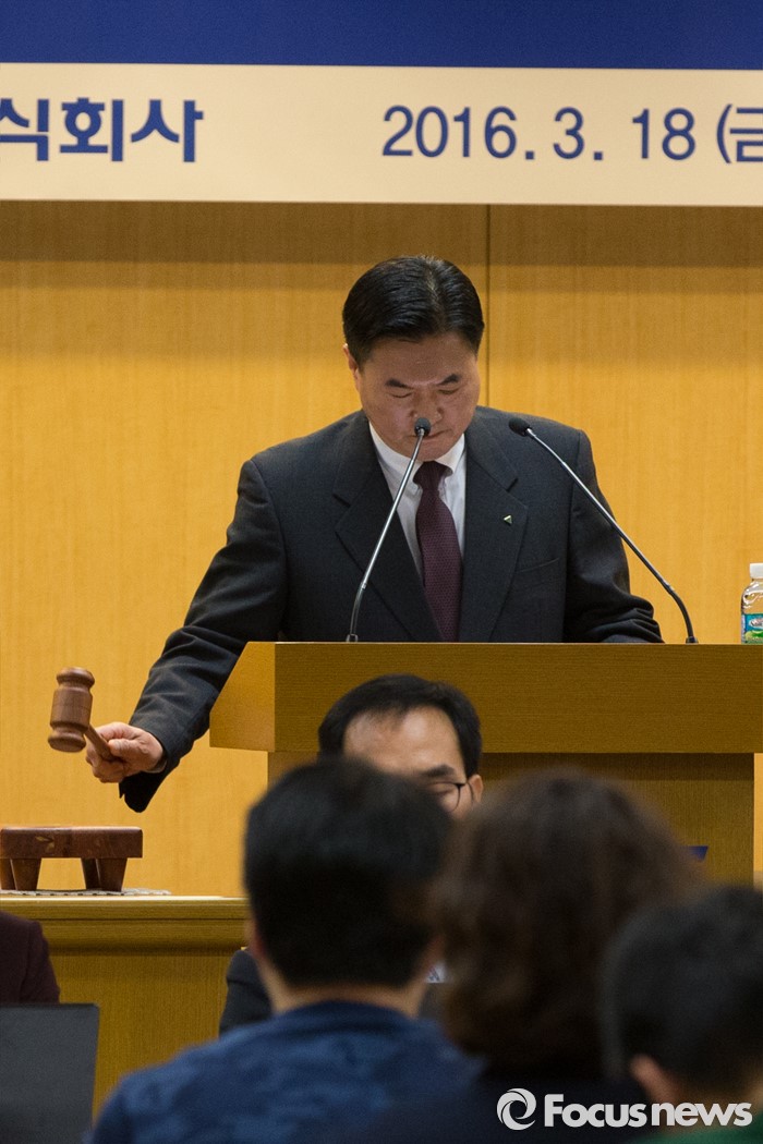 현재 출자전환 등 내용이 담긴 채무조정안에 대한 구체적 내용에 관심이 쏠리고 있다.(서울=포커스뉴스) 이백훈 현대상선 대표이사가 18일 오전 서울 종로구 현대그룹빌딩에서 열린 제40기 정기주주총회에서 의사봉을 두드리고 있다. 2016.03.18 허란 기자