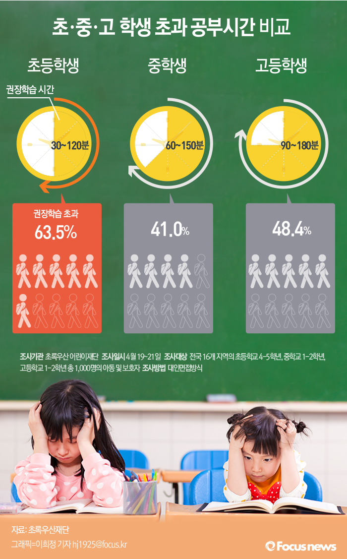 (서울=포커스뉴스) 12일 초록우산어린이재단 아동복지연구소가 우리나라 초·중·고교생 1000명을 대상으로 생활 시간을 분석한 결과 초등학생 63.5%가 권장 공부시간보다 더 많이 공부하는 것으로 조사됐다.