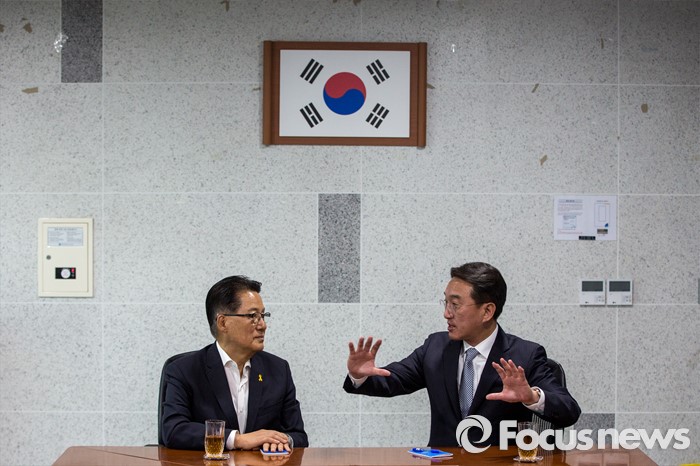 | △ 의견 나누는 박지원 원내대표-현기환 정무수석 |