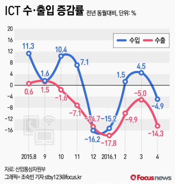 (서울=포커스뉴스) 12일 산업통상자원부에 따르면 지난 4월 정보통신기술(ICT) 수출이 전년 동월대비 14.3% 감소한 125조3000억 달러를 기록했다. 수입은 4.9% 감소한 72조7000억 달러를 기록했다.