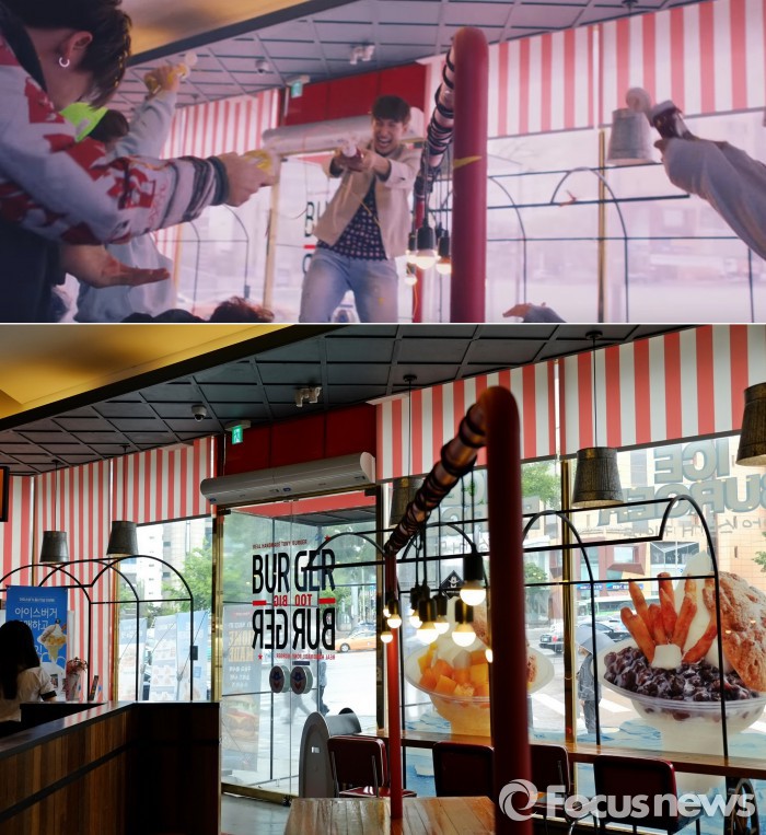 이는 서울 청담역 근처의 한 햄버거 가게에서 촬영 됐다. 미국 서부 카우보이를 연상케하는 인테리어가 시선을 잡아끈다. 역마차바퀴, 청바지 등의 표현물로 19세기 분위기를 재현했다. 멤버들은 햄버거 가게 속 가장 넓은 8인석 테이블에 앉아 뮤직비디오를 촬영했다.