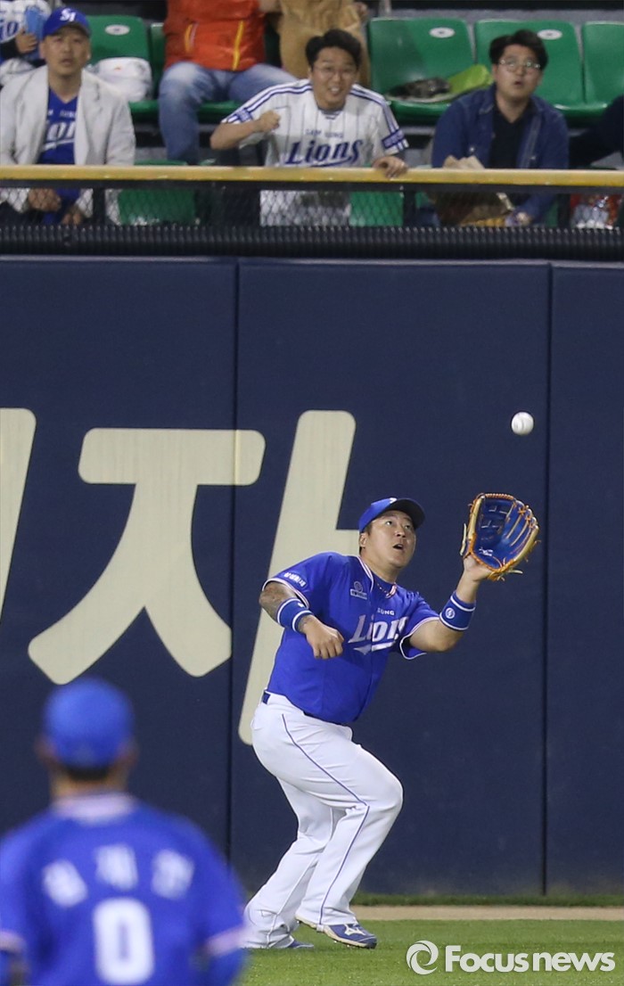 (서울=포커스뉴스) 12일 서울 잠실구장에서 열린 2016 프로야구 삼성-LG 경기 6회말 1사 2루에서 삼성 좌익수 최형우가 LG 채은성이 날린 타구를 펜스 앞에서 잡고 있다.