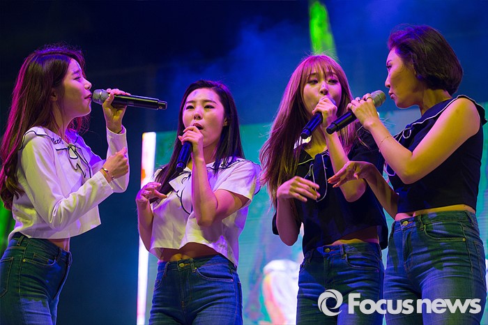 (서울=포커스뉴스) 12일 오후 서울 광진구 건국대학교 대운동장에서 열린 '2016 건국대학교 대동제'에서 걸그룹 마마무가 무대를 선보이고 있다. 왼쪽부터 솔라, 휘인, 문별, 화사