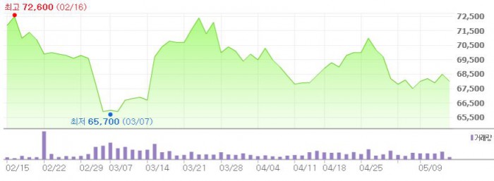 이에 따라 빙그레에 대한 목표주가를 종전 9만3000원에서 7만1000원으로 하향 조정했다.최근 3개월간 빙그레 주가 추이 <그래픽출처=네이버>