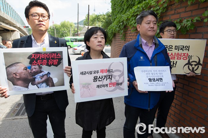 (서울=포커스뉴스) 13일 오전 서울 용산구 미8군 2번 게이트 앞에서 전쟁반대평화실현국민행동을 비롯한 시민단체 회원들이 '서울 한복판 지카바이러스 실험추진, 주한미군 규탄 기자회견'을 마치고 항의서한을 전달하기 위해 이동하고 있다.