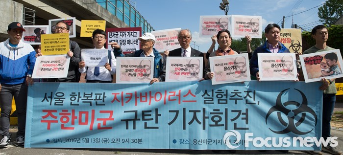 (서울=포커스뉴스) 13일 오전 서울 용산구 미8군 2번 게이트 앞에서 전쟁반대평화실현국민행동을 비롯한 시민단체 회원들이 '서울 한복판 지카바이러스 실험추진, 주한미군 규탄 기자회견'을 하고 있다.