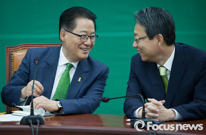 (서울=포커스뉴스) 박지원 국민의당 원내대표와 김성식 정책위의장이 13일 오전 서울 여의도 국회에서 열린 최고위원회의에 참석해 대화를 나누고 있다.