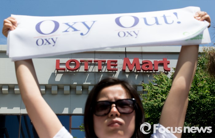 (서울=포커스뉴스) 13일 오전 서울 중구 롯데마트 서울역점 앞에서 환경운동연합과 가습기 살균제 피해자 가족모임이 '옥시 제품 즉각 판매 중단'을 촉구하고 있다.