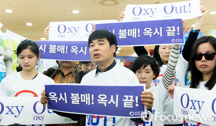 (서울=포커스뉴스) 13일 오전 서울 중구 롯데마트 서울역점에서 환경운동연합과 가습기 살균제 피해자 가족모임이 '옥시 제품 즉각 판매 중단'을 촉구하고 있다.
