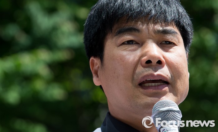 (서울=포커스뉴스) 13일 오전 서울 중구 롯데마트 서울역점 앞에서 염형철 환경운동연합 사무총장이 '옥시 제품 즉각 판매 중단'을 촉구하고 있다.