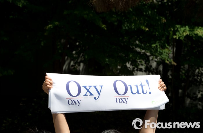 (서울=포커스뉴스) 13일 오전 서울 중구 롯데마트 서울역점 앞에서 환경운동연합과 가습기 살균제 피해자 가족모임이 '옥시 제품 즉각 판매 중단'을 촉구하고 있다.