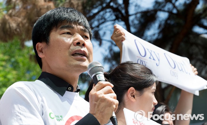 (서울=포커스뉴스) 13일 오전 서울 중구 롯데마트 서울역점 앞에서 염형철 환경운동연합 사무총장이 '옥시 제품 즉각 판매 중단'을 촉구하고 있다.