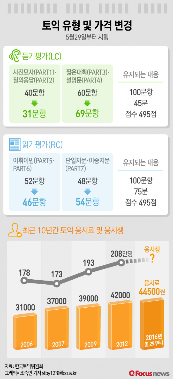 (서울=포커스뉴스) 한국토익위원회가 5월29일부터 토익 유형 및 가격이 변경된다고 13일 밝혔다.