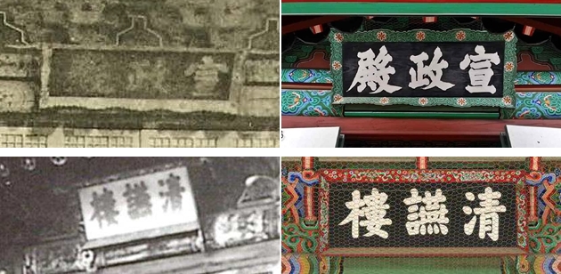 창덕궁 선정전 현판 등 원형 색상에 대한 고증이 명확하지 않은 글자색 2건과 오류사항을 분명히 확인할 수 있으나 세부적으로 원래의 형태‧단청‧장식을 재현하기 어려운 형태 5건(창덕궁 소요정 현판 등), 단청‧장식 9건(경복궁 건춘문 현판 등) 등 16건은 현 상태를 유지하되 추후 현판 노후 등으로 인한 수리상황 발생 시 추가 고증조사와 문화재위원회 심의를 거쳐 정비할 예정이다.글자색 오류가 확인된 창덕궁 선정전 현판(위쪽)과 바탕색 오류가 확인된 경복궁 청연루 현판.<사진제공=문화재청>