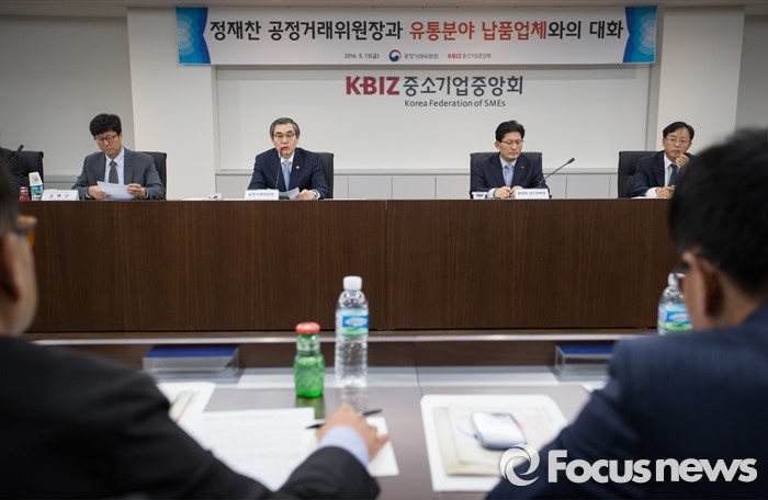 (서울=포커스뉴스) 정재찬(왼쪽 두번째) 공정거래위원장이 13일 오후 서울 여의도 중소기업중앙회에서 열린 유통분야 납품업체 간담회에 참석해 발언하고 있다.